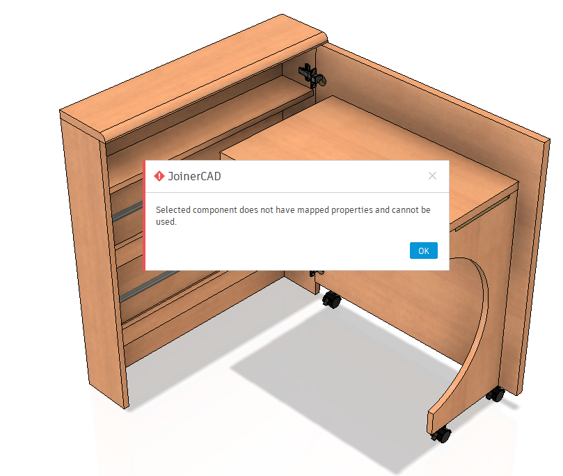 A typical error users may encounter when inserting hardware components is that JoinerCAD displays the message: "Selected component does not have mapped properties and cannot be used."